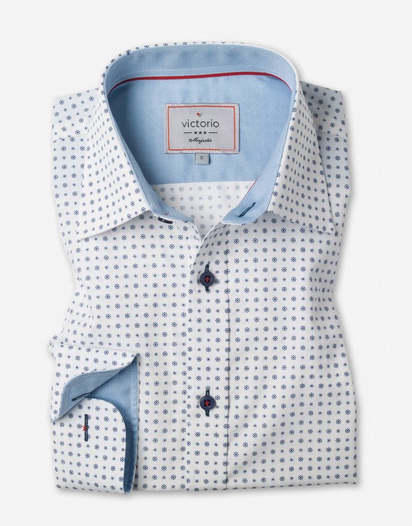 Marie Pokorna, 07.02.2026Luxusní pánská košile moderního designu v bílé barvě. Zajímavý design košile. Košile bílé barvy je zdobena modrými kytičkami. Tento model pánské košile je ušitý ze 100% bavlny, která je příjemná na dotek a zajistí majiteli vysoké pohodlí během nošení. Zapínání košile na klasické knoflíky. Límec jednoduchého střihu - Kent. Tento elegantní model košile zaujme. V této košili zaujmete na každém pracovním setkání či pohovoru ale i na romantické večeři s partnerkou. Možnost nošení i s manžetovými knoflíčky. Podbarvení límce a širokých manžet do jemné modré barvy. Střih košile slim fit dokonale zvýrazní mužskou postavu a podtrhne její jedinečnost.