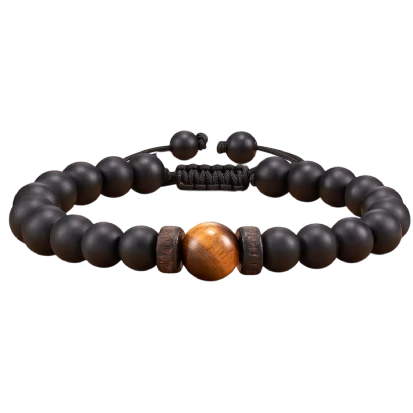 Černý korálkový náramek, který je oživen kontrastní korálkem uprostřed náramku. . Nastavitelná velikost za pomoci stahovacích šňůrek.