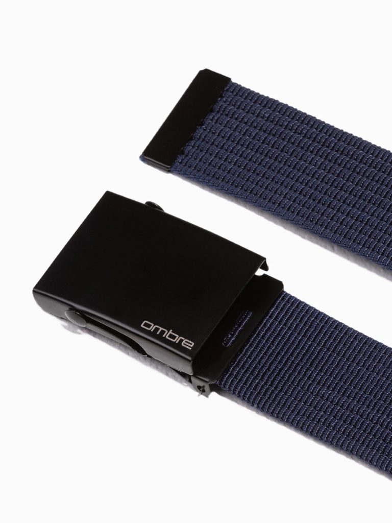 Pánský látkový opasek s černou kovovou přezkou a nastavitelnou délkou.