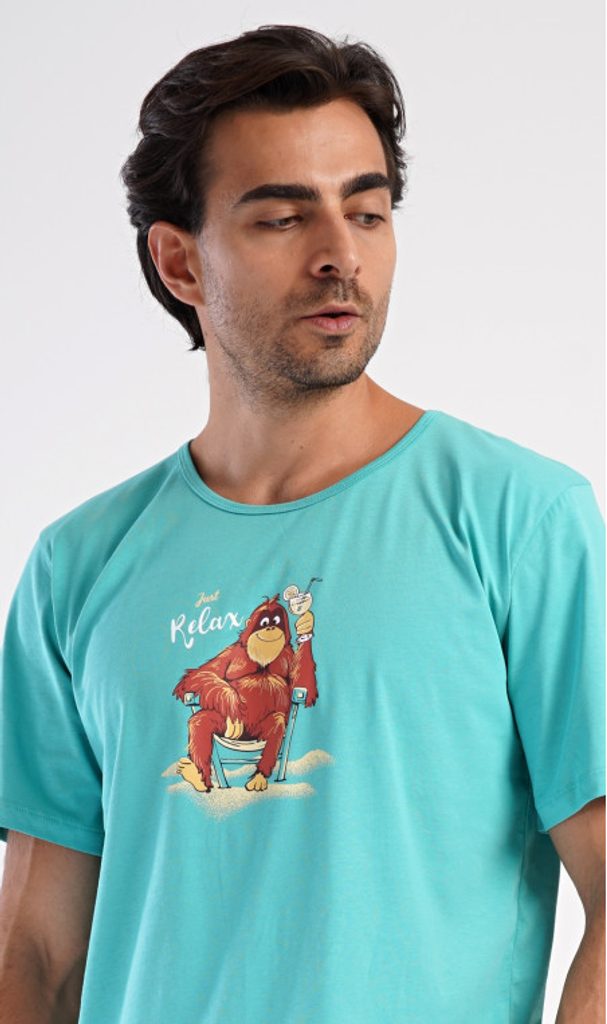 Pyžamo je vyrobeno z bavlny. Úplet je vhodný pro ty, kteří vyhledávají přírodní materiály. Na jednobarevném tričku s kulatým výstřihem je potisk odpočívající opice s nápojem. Šortky mají kapsy, elastický pas a šňůrku na stažení. Vhodné jako dárek pro každého muže.