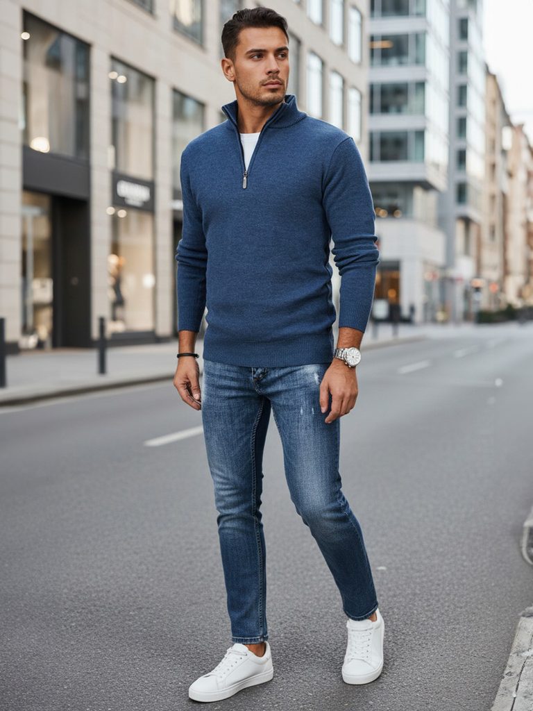 Moderní modrý pánský svetr na zip