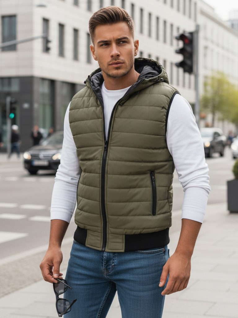 Prošívaná podšitá vesta s kapucí disponuje klasickým zapínáním na zip. Vesta obsahuje dvě vnější kapsy na zip. Kapuce není odnímatelná, dá se regulovat pomocí šňůrky. Spodní část i otvory na ruce jsou zakončeny elastickým lemováním. Vestu doporučujeme kombinovat s džíny z naší nabídky.